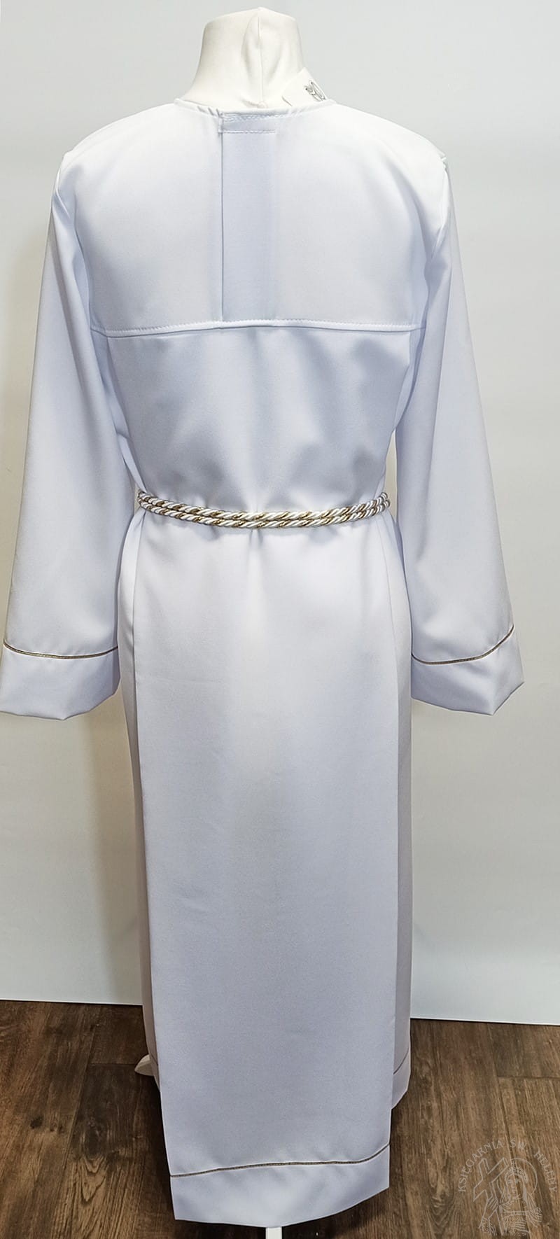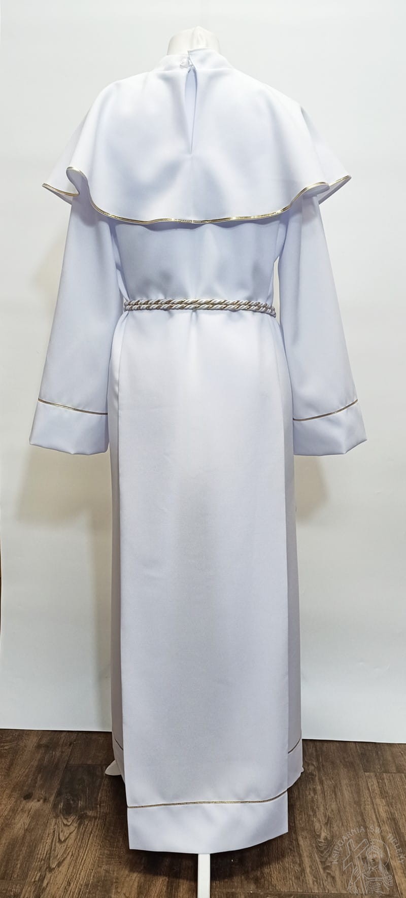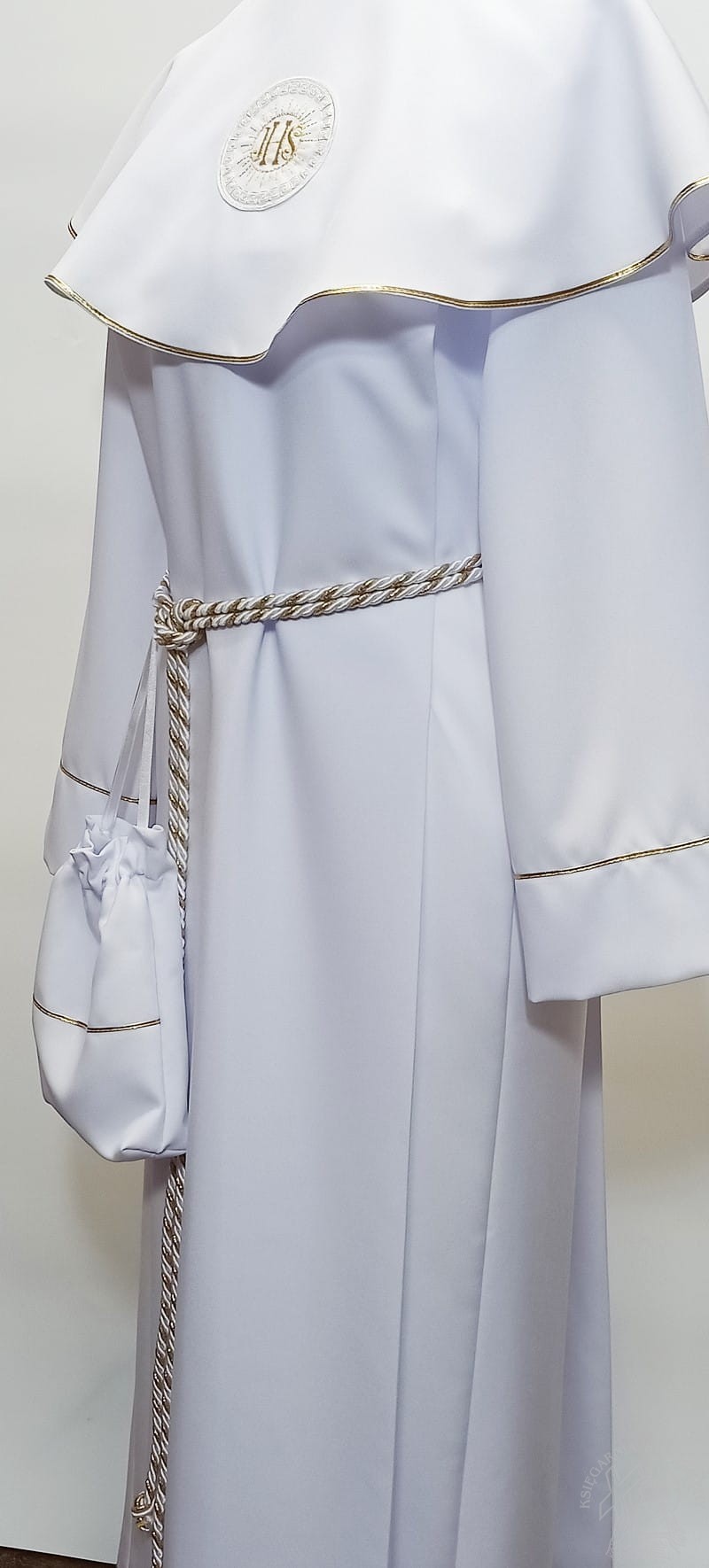 Alba komunijna dziewczęca prosta, wiązana złotym sznurem. Pelerynka zdobiona aplikacją komunijną IHS, obrzeża pelerynki, rękawy i dół alby zdobiony delikatną złotą tasiemką. Z tyłu zapinana na rzep. W zestawie torebeczka - sakiewka na rączkę. Alba prosta, subtelna, bez nadmiernych zdobień. Uszyta w polskim zakładzie krawieckim na północy kraju.