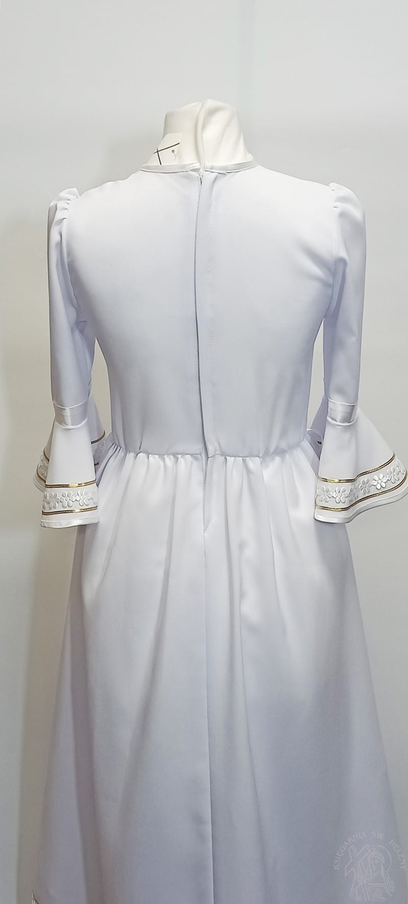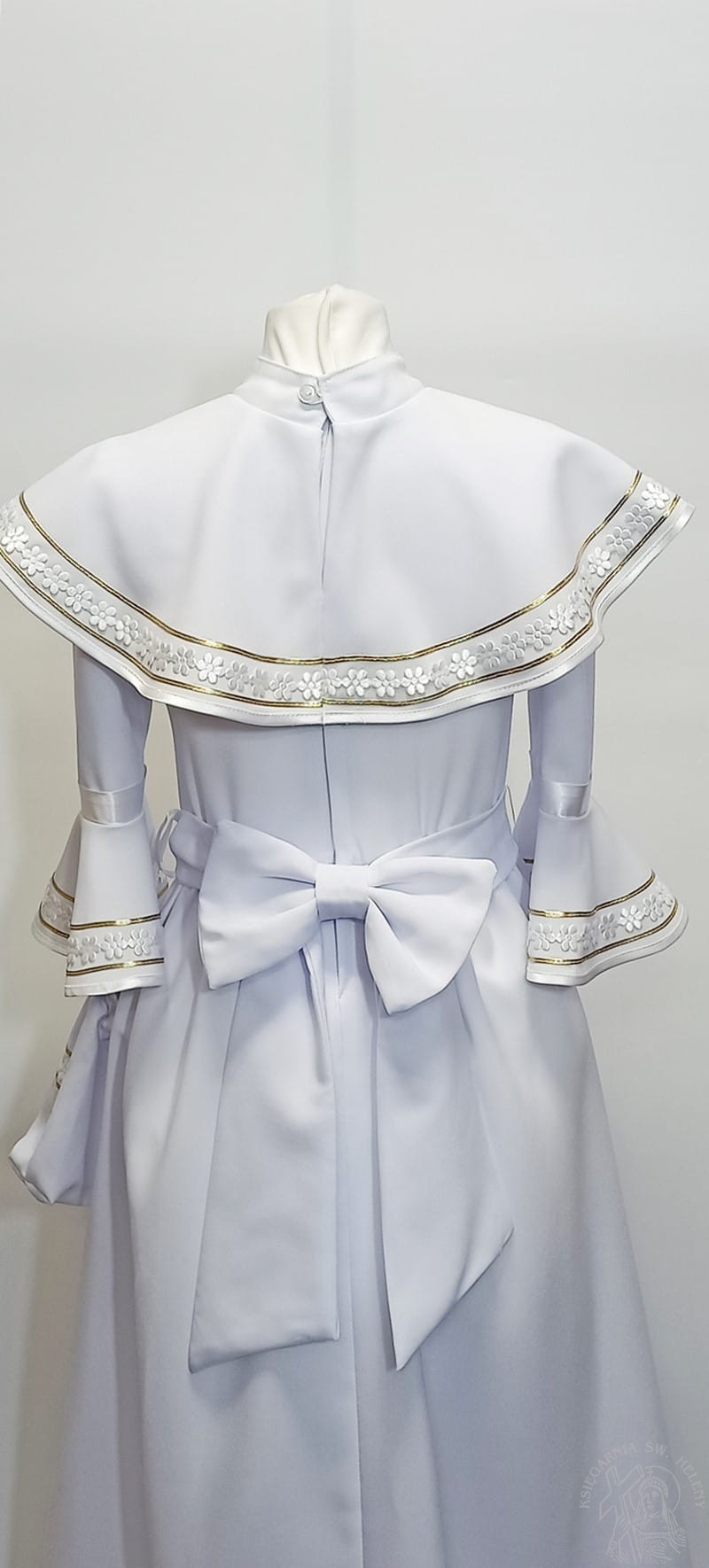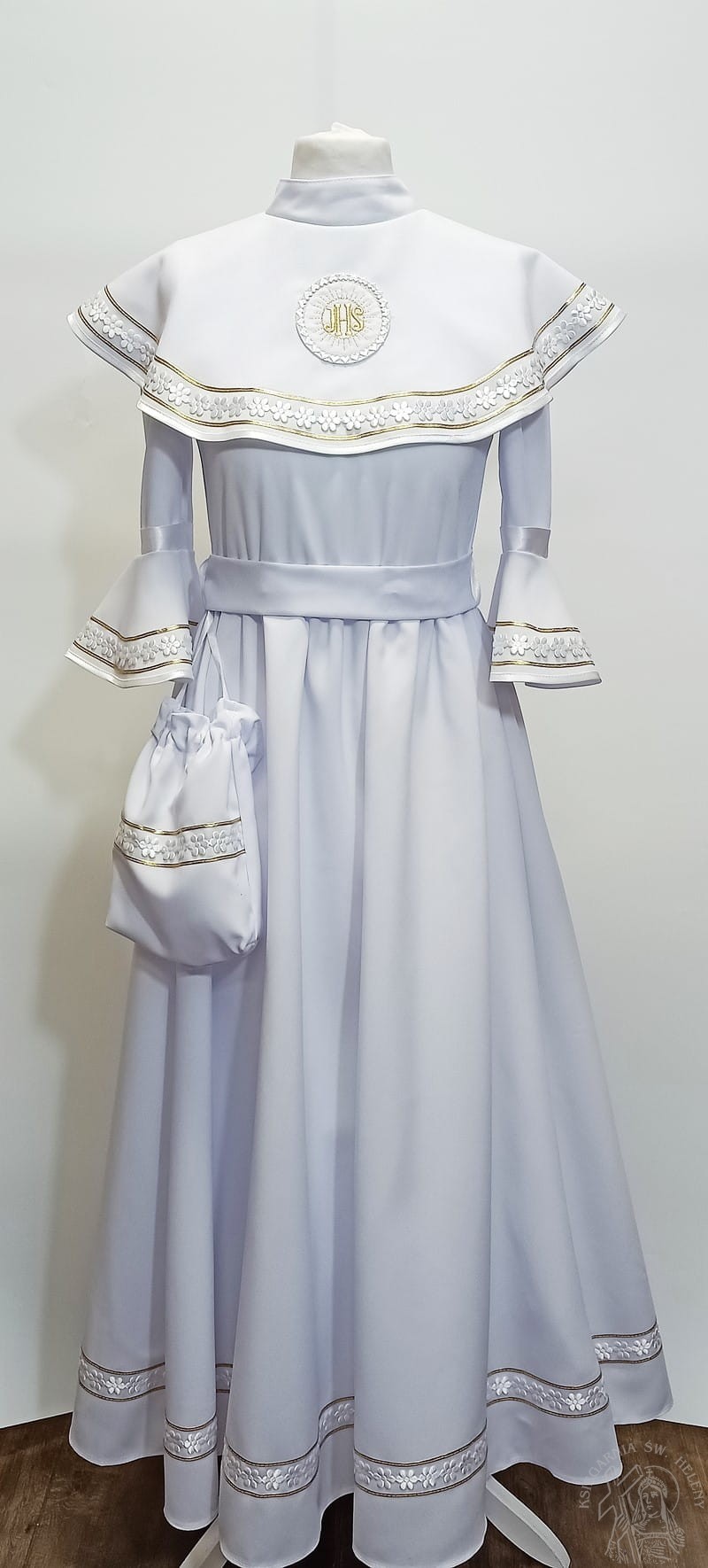 Alba komunijna sukienkowa, to sukienka z kołnierzem/ozdobną pelerynką z aplikacją komunijną IHS. Zdobiona tasiemkami w kolorze złotym i białymi margaretkami. Długość rękawa 3/4 z ozdobnym wachlarzowym wykończeniem. Rozpinana z tyłu do pasa, co ułatwia zakładanie i zdejmowanie sukienki. W pasie wszyta gumeczka, a z tyłu znajduje się duża kokarda ściągająca pas. Kołnierz zapinany z tyłu na guzik. W zestawie znajduje się torebeczka tzw sakiewka / woreczek na rękę. Alba szyta w polskim zakładzie krawieckim na terenie naszego kraju.