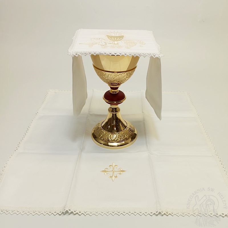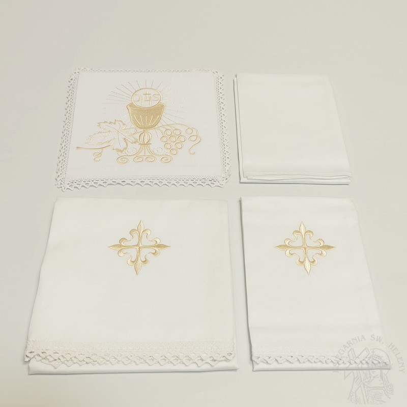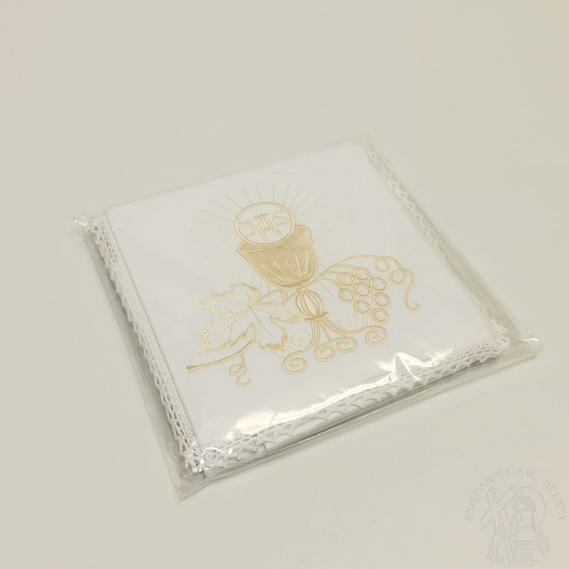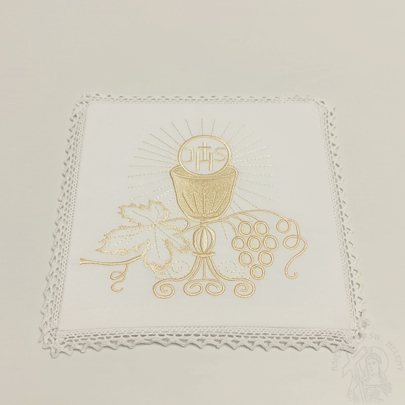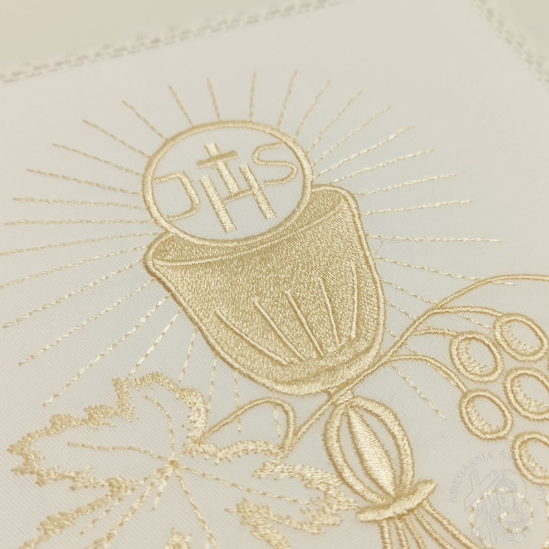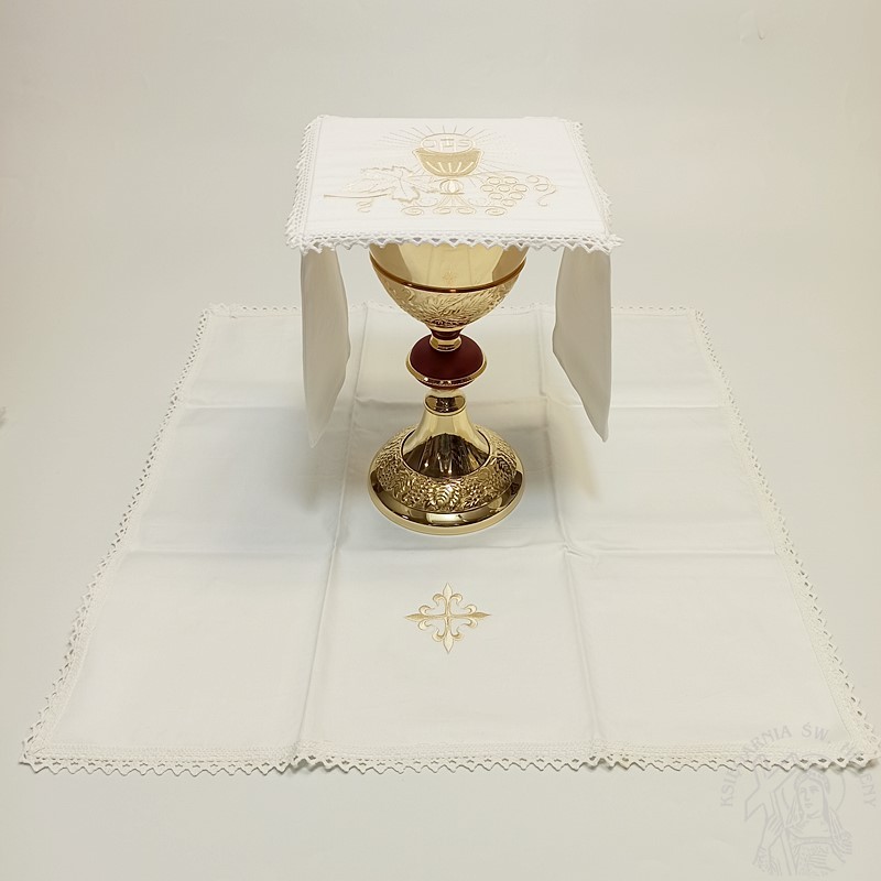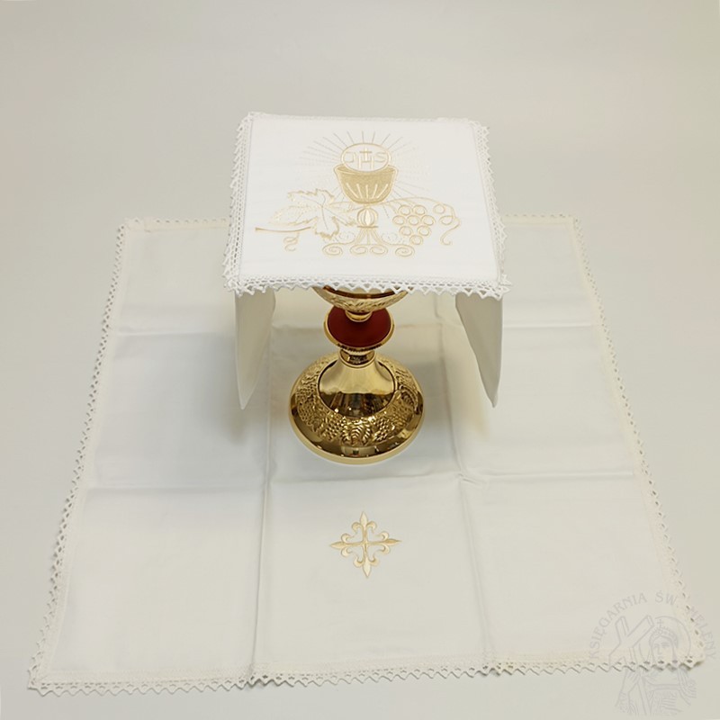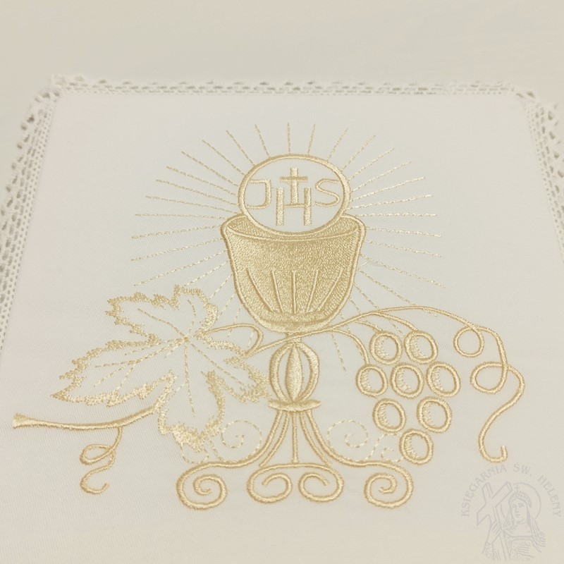 Bielizna kielichowa 100% bawełny, bawełna wysokiej jakości, gładka i lśniąca. Haft maszynowy wykonany bardzo starannie przedstawiający kielich i Hostię.