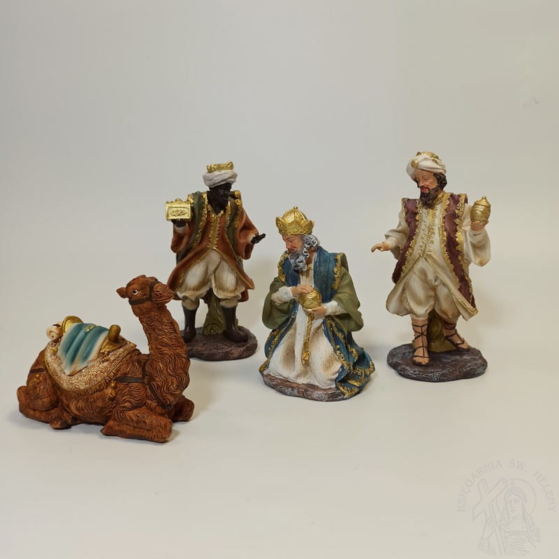 Figury do szopki Bożonarodzeniowej wykonane z żywicy syntetycznej. Figury mają różną wysokość. Najwyższa figur ma 21cm. W zestawie znajduje się 8 figur.
