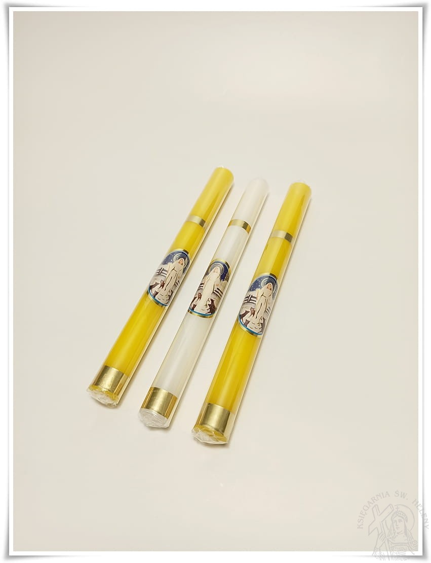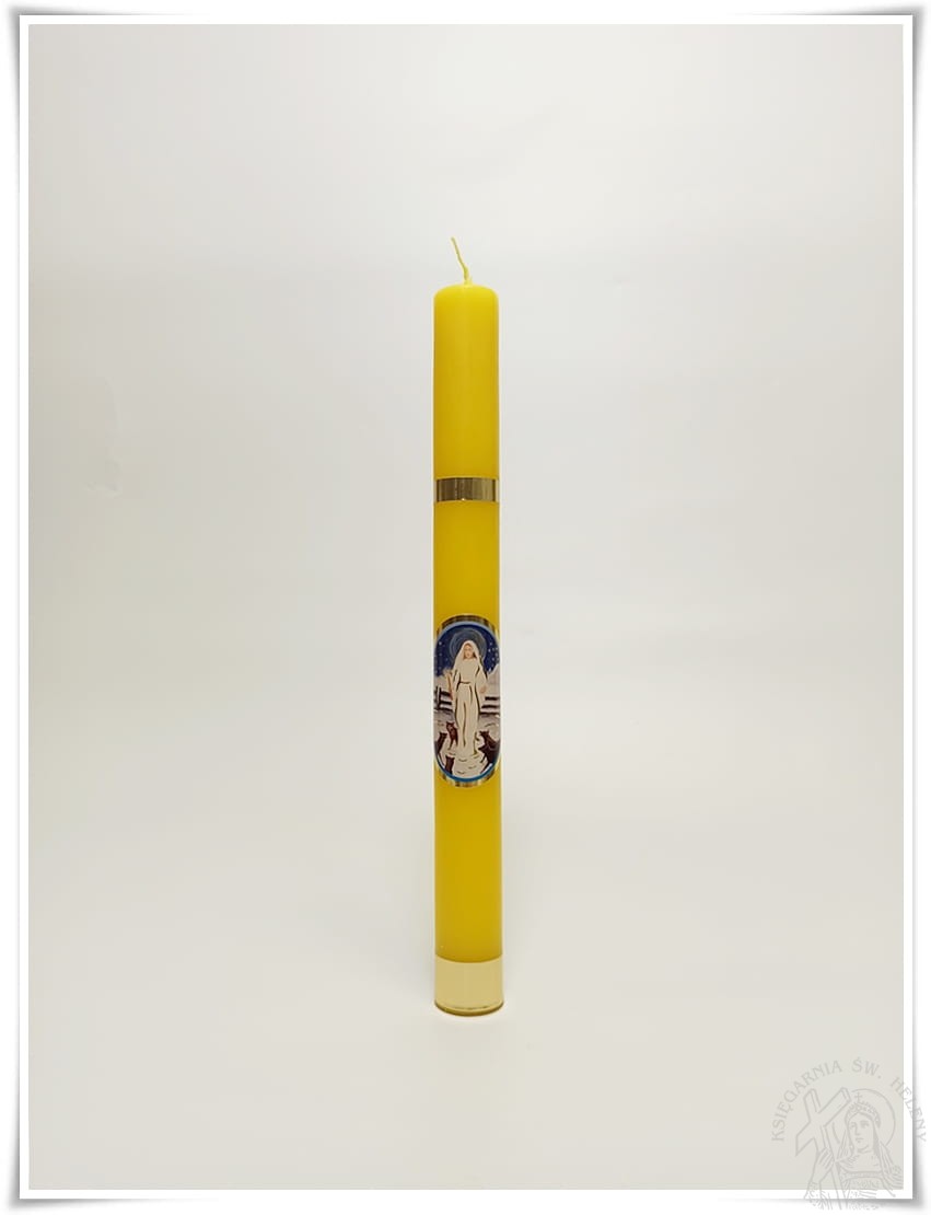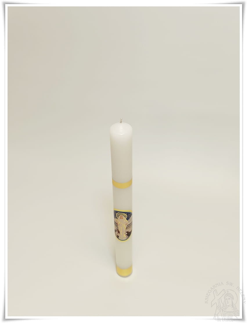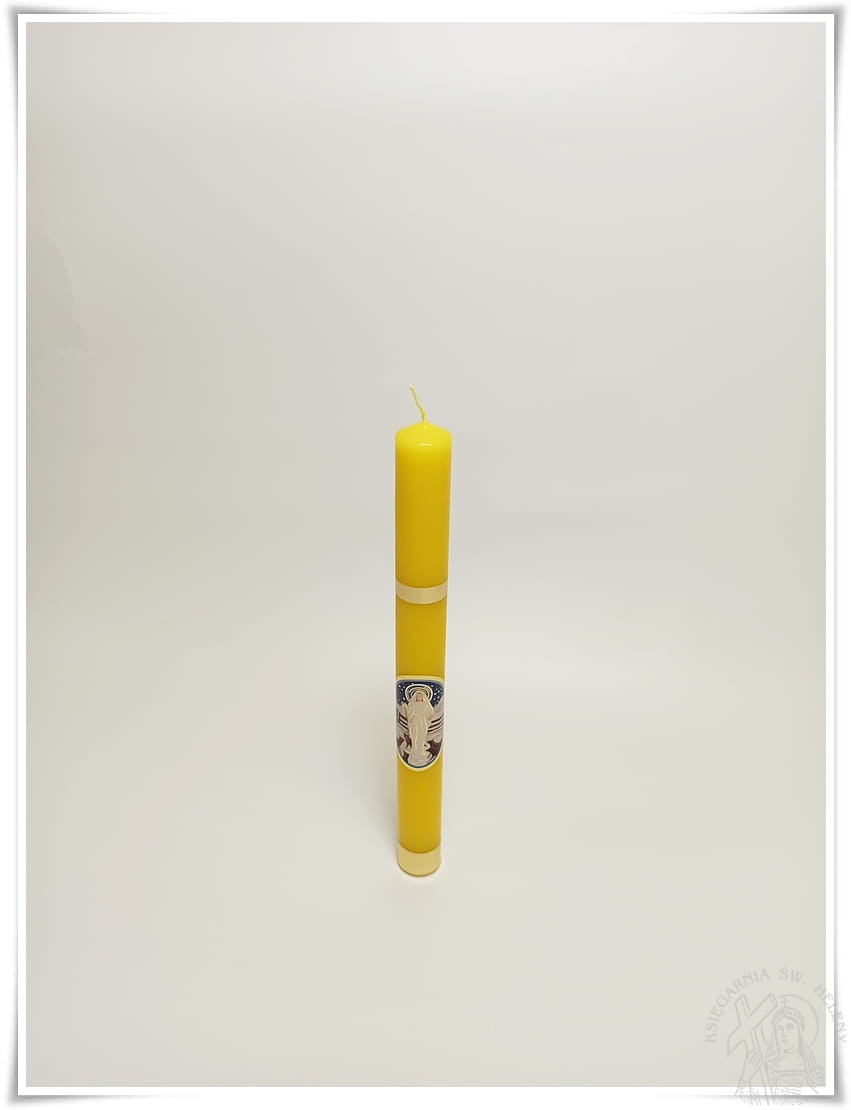 Świeca gromnica z naklejaną dekoracją wizerunkiem Matki Bożej gromnicznej w kolorze białym i żółtym.