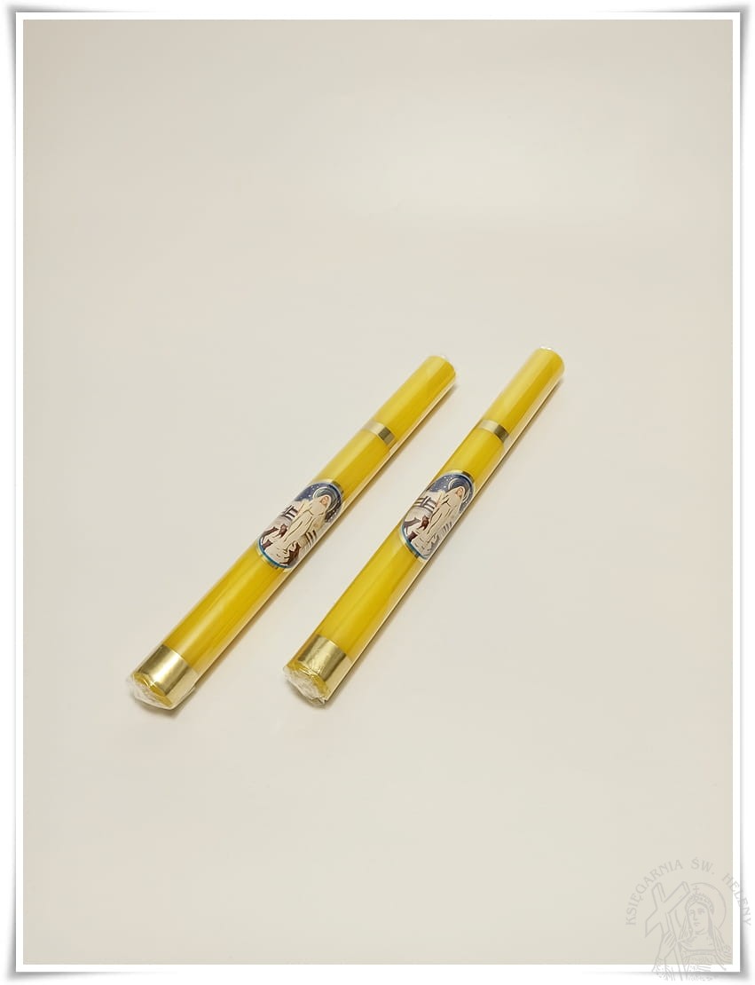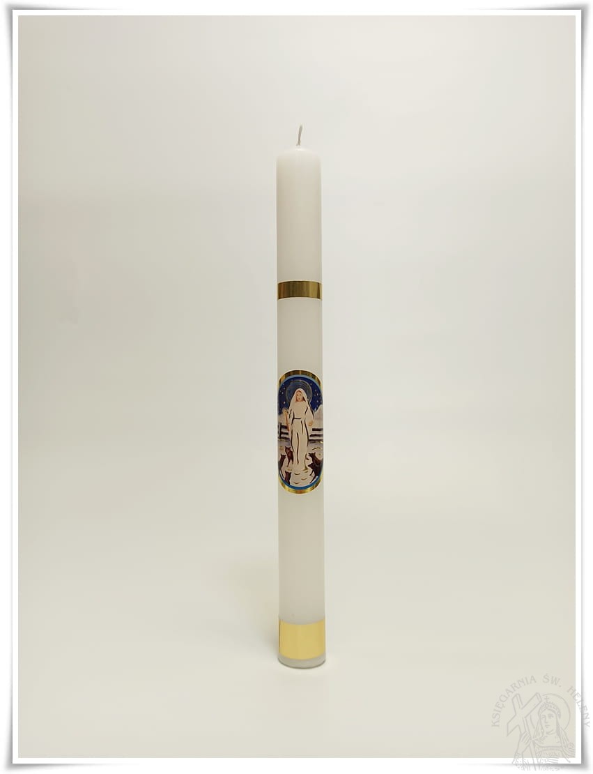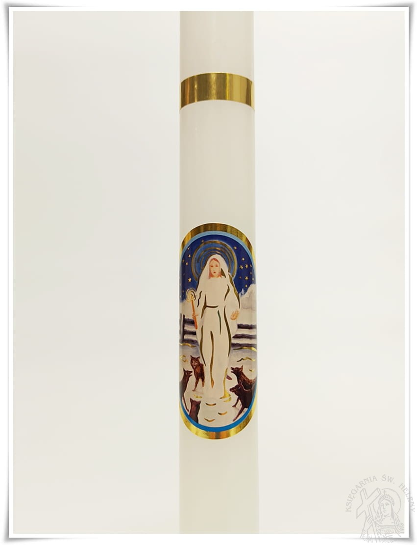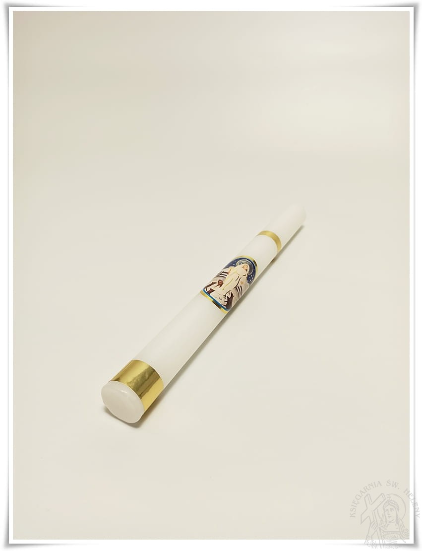 Świeca gromnica z naklejaną dekoracją wizerunkiem Matki Bożej gromnicznej w kolorze białym i żółtym.