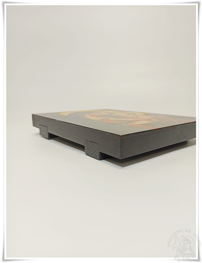 Ikona malowana farbami olejnymi na desce z drzewa liściastego, z klinami dębowymi.