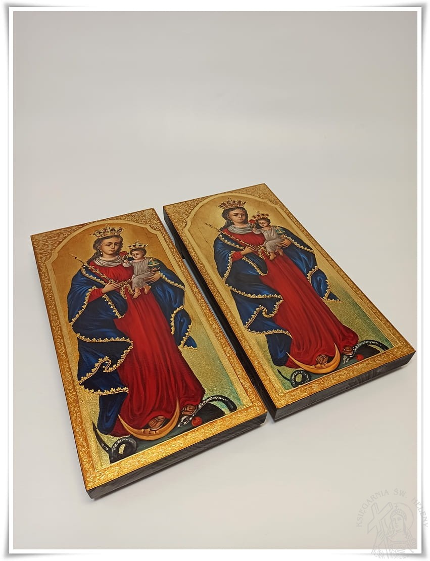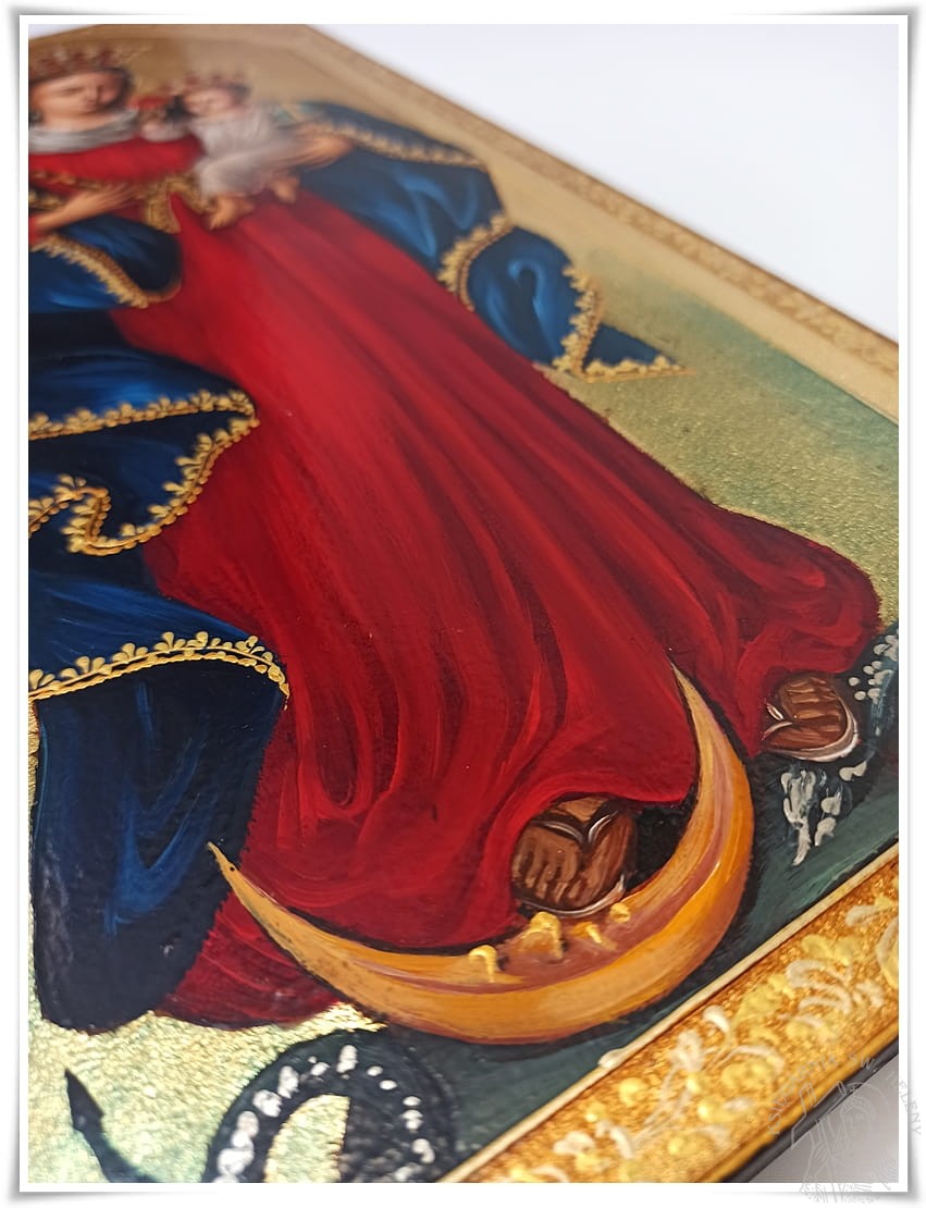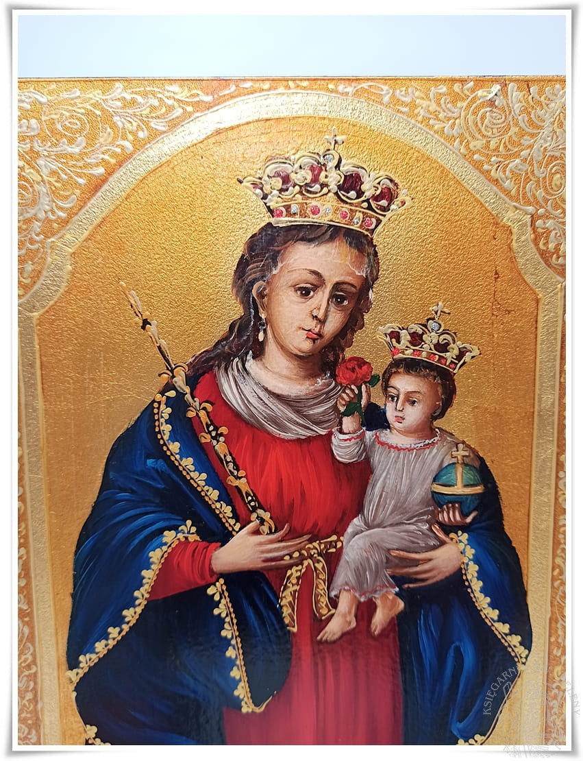 Obraz ten przedstawia Matkę Najświętszą, która w lewej ręce trzyma Dzieciątko Jezus, a w prawej złote berło. Twarz Maryi ma wyraziste rysy młodej, pięknej kobiety, zwróconej lekko w lewą stronę. Prawe ucho Najświętszej Panienki, ozdobionej jest złotym kolczykiem. Odsłonięte ucho sprawia wrażenie, jakby słuchała próśb wiernych. Madonna ma długie, ciemne włosy, które opadają jej na ramiona. Ubrana jest w długą pofałdowaną suknię sięgającą, aż do stóp, czerwono-karminową szatę, przewiązana w pasie złocista wstęgą. Jej dekolt okala biała, udrapowana chusta, spod której wystaje koronka od sukienki. Ramiona Maryi okrywa pofałdowany, ciemnobłękitny płaszcz. Stopy Matki Bożej depczą wijącego się na kuli ziemskiej węża, trzymającego w pysku gałązkę z jabłkiem. Obok widoczny jest złoty róg półksiężyca z ludzką twarzą. Dzieciątko Jezus podtrzymuje w swej lewej rączce błękitne jabłko królewskie ze złotym krzyżykiem i złotą opaską. W prawej natomiast trzyma czerwoną różę. Dzieciątko ubrane jest w prześwitującą, białą, cienką szatę, wykończoną czerwonym ornamentem. Na głowie Maryi i Jezusa umieszczone są złote korony, wysadzane kamieniami i małym krzyżykiem.