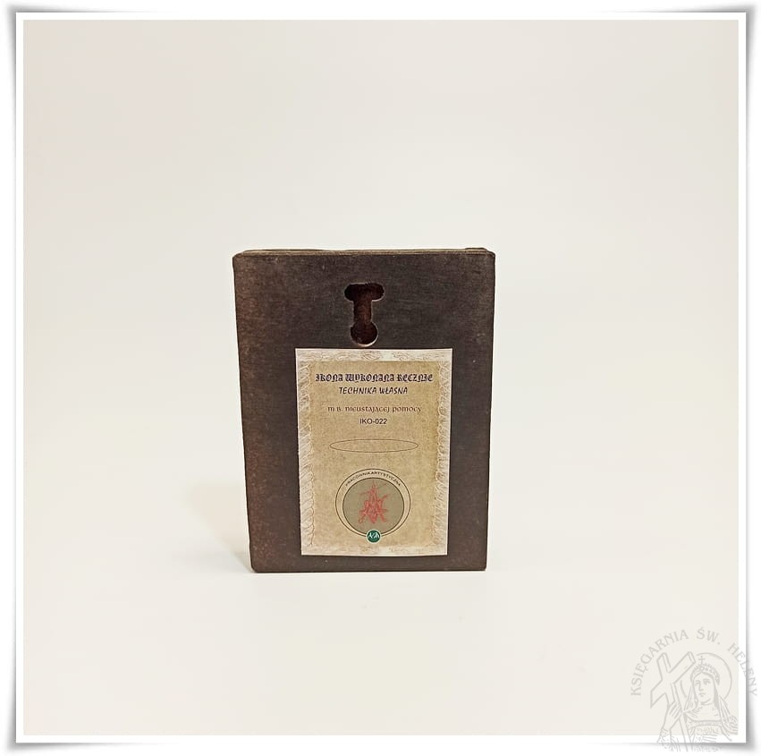 Ikona wykonana techniką własną w pracowni artystycznej, złocona, lakierowana. Wizerunek Matki Bożej Nieustającej Pomocy naniesiony specjalną techniką własną wypracowaną przez lata doświadczeń Pracowni artystycznej w naszym kraju. Jest to wyrób krajowy. Z tyłu ikony znajduje się otwór umożliwiający powieszenie ikony na ścianie. Ramka ikony postarzona i złocona.