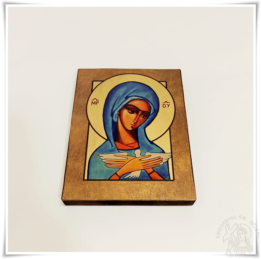 Ikona wykonana techniką własną w pracowni artystycznej, złocona, lakierowana. Wizerunek Matki Bożej niosącej Ducha Świętego został naniesiony specjalną techniką własną wypracowaną przez lata doświadczeń Pracowni artystycznej w naszym kraju. Jest to wyrób krajowy. Z tyłu ikony znajduje się otwór umożliwiający powieszenie ikony na ścianie. Ramka ikony postarzona i złocona.