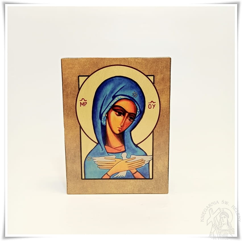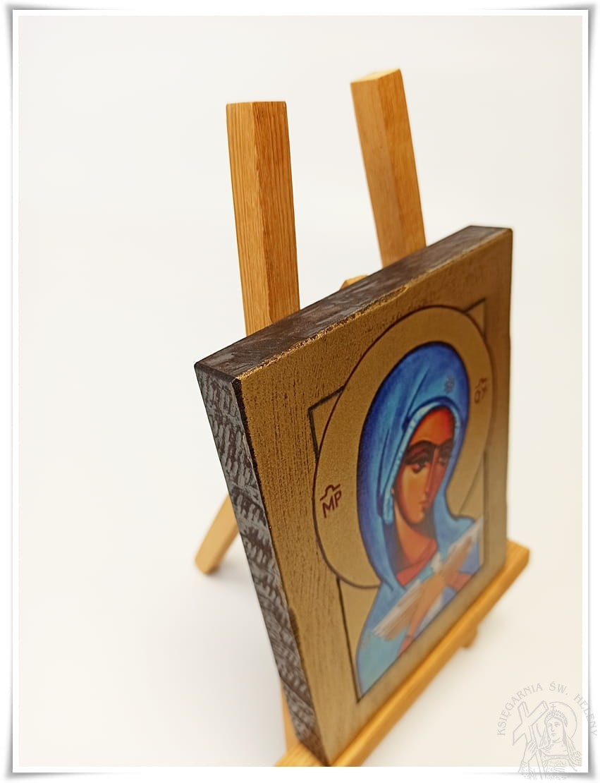 Ikona wykonana techniką własną w pracowni artystycznej, złocona, lakierowana. Wizerunek Matki Bożej niosącej Ducha Świętego naniesiony specjalną techniką własną wypracowaną przez lata doświadczeń Pracowni artystycznej w naszym kraju. Jest to wyrób krajowy. Z tyłu ikony znajduje się otwór umożliwiający powieszenie ikony na ścianie. Ramka ikony postarzona i złocona.
