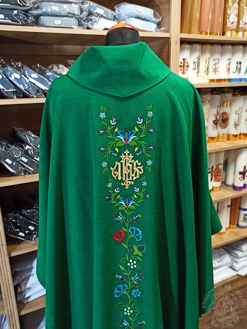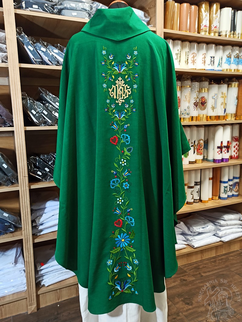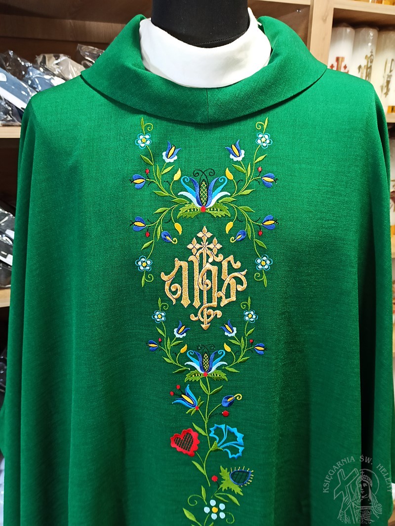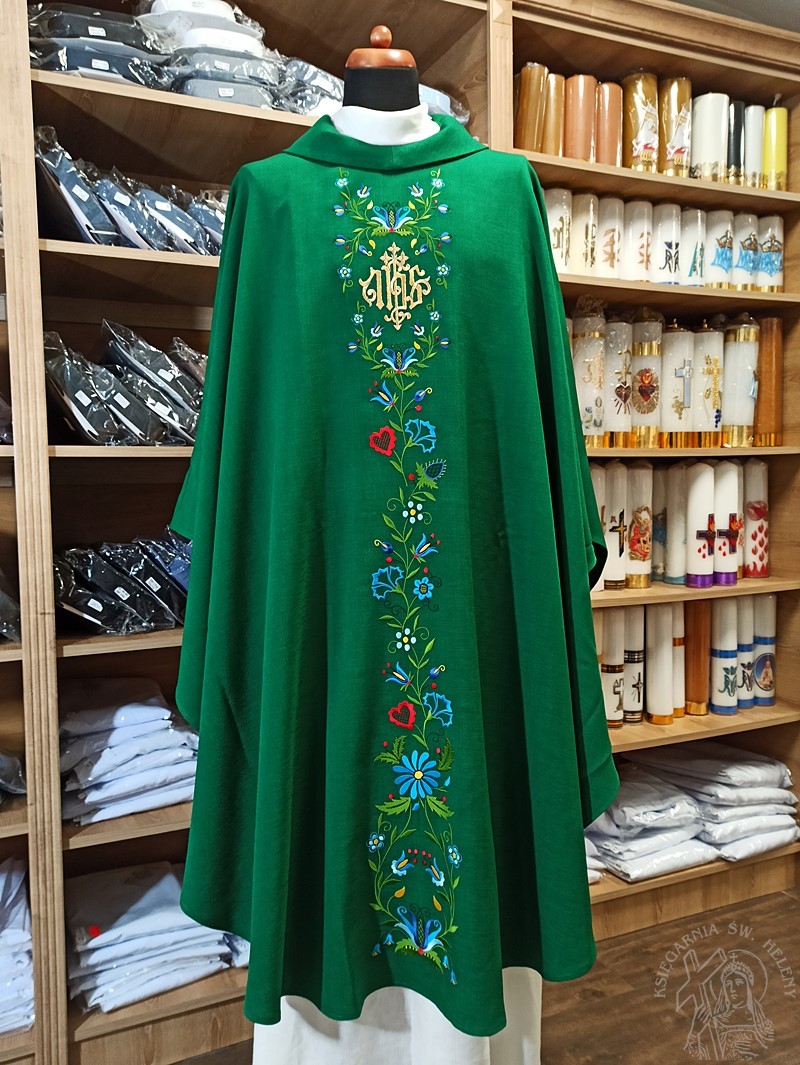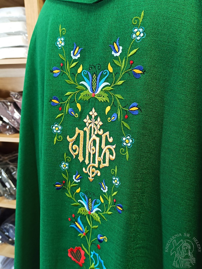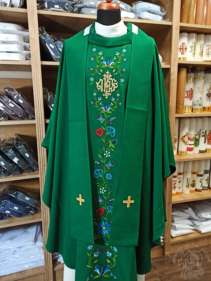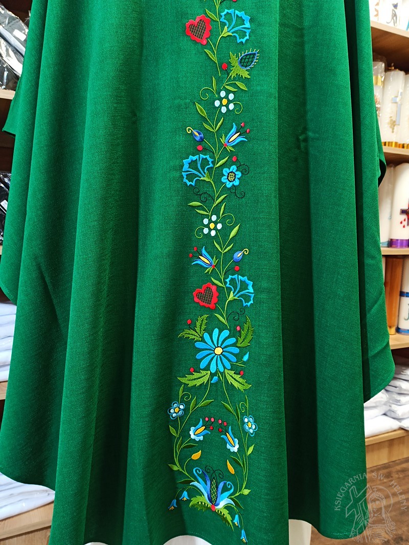 Ornat haftowany w pracowni haftu artystycznego w Polsce, wykonany z wielką starannością haft maszynowy. Haftowany na całej długości przodu i tyłu. Bogactwo haftu ukazuje piękno kaszubskiej kultury, folkloru i regionu. Ornat uszyty z lekkiej i przewiewnej tkaniny. Delikatny wzór kaszubski wyhaftowany został na środku ornatu  po obu stronach.