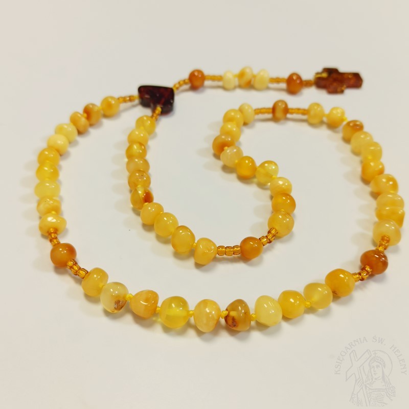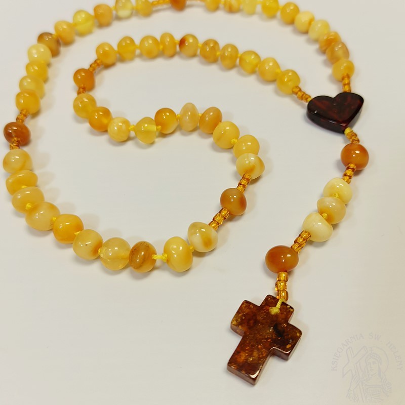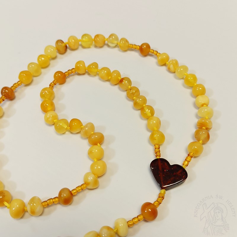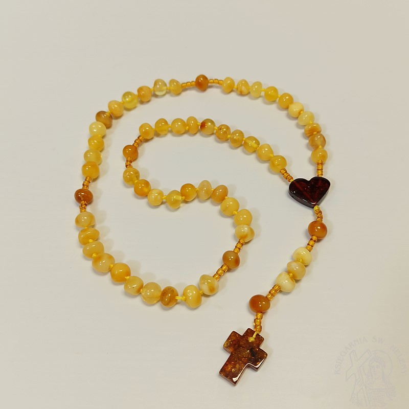 Nieduży różaniec z prawdziwego bursztynu w kolorze żółtym, mocowany na sznurku jubilerskim. Bardzo mocny i wytrzymały. Paciorki różańca kuleczki o nieregularnym kształcie, dobrze wyczuwalne w dłoni. Krzyżyk i łącznik wykonany również z bursztynu, łącznik w kształcie uroczego serduszka. Różaniec odpowiedni dla dziewczynki na pamiątkę I Komunii świętej.