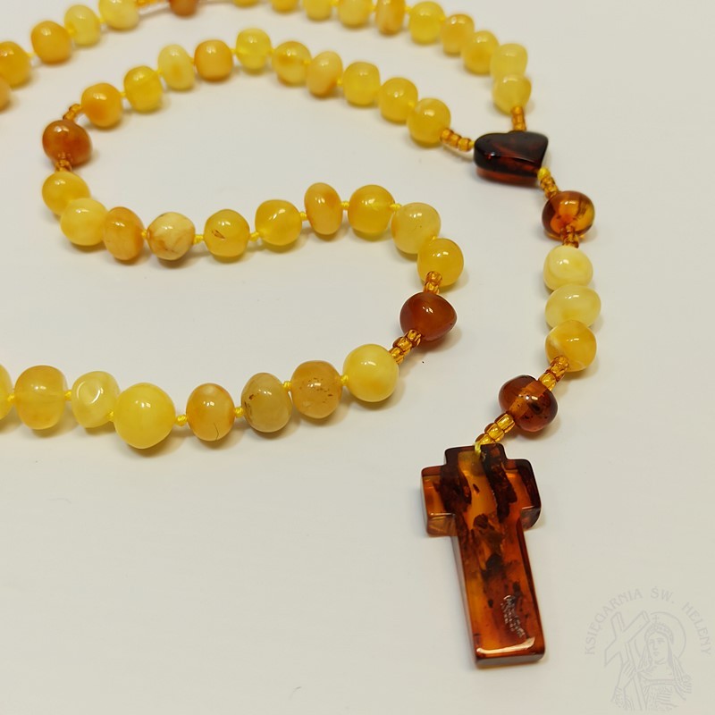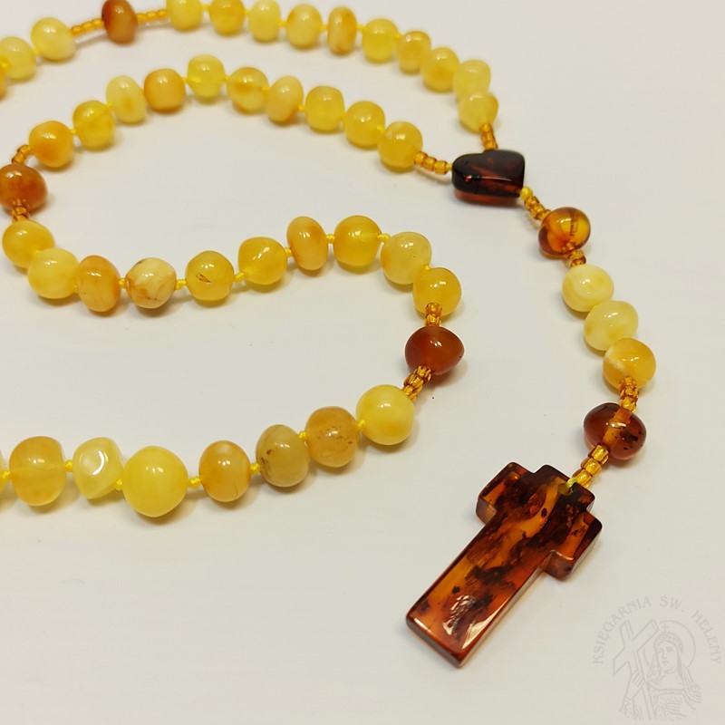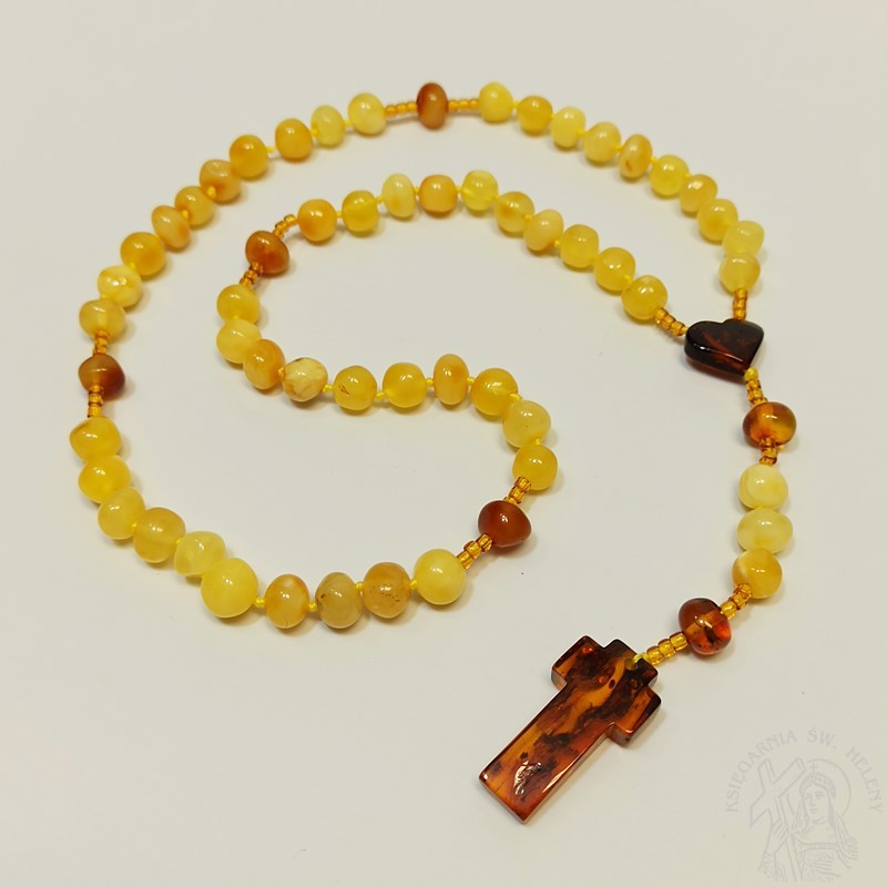 Różaniec z prawdziwego bursztynu w kolorze jasno żółtym. Bardzo mocny i wytrzymały. Paciorki różańca kształt nieregularny, dobrze wyczuwalne w dłoni, pękate fasolki. Krzyżyk i łącznik wykonany również z bursztynu, łącznik w kształcie serduszka. Piękna pamiątka I Komunii Świętej dla dziewczynki.
