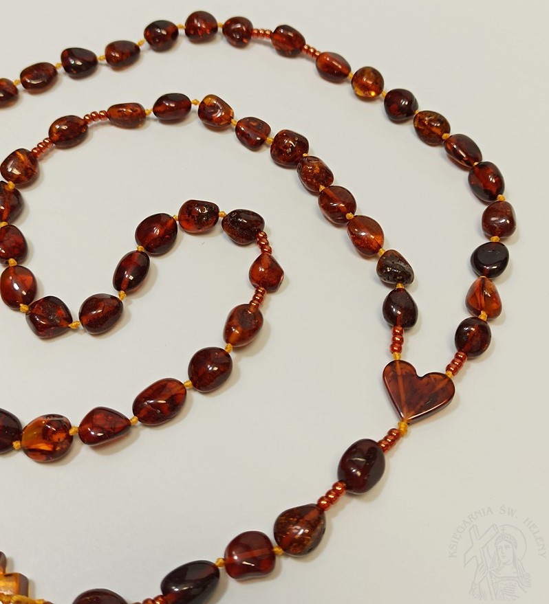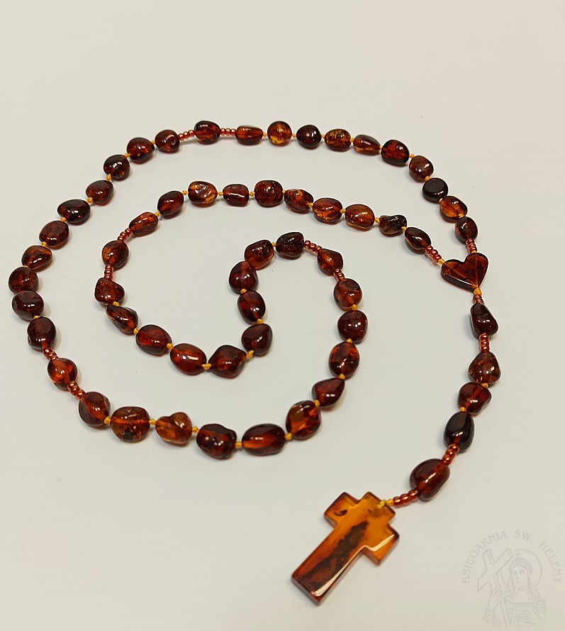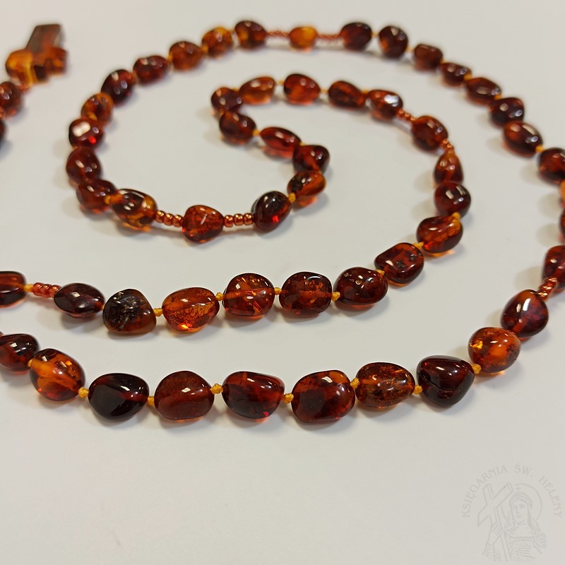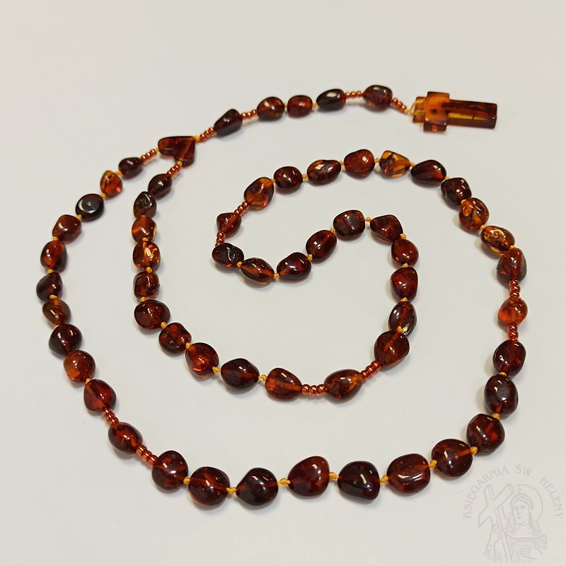 Różaniec z prawdziwego bursztynu w kolorze koniakowym. Bardzo mocny i wytrzymały. Paciorki różańca pękate fasolki o różnym kształcie i wielkości, dobrze wyczuwalne w dłoni.
