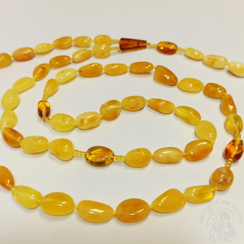 Różaniec z prawdziwego bursztynu w kolorze żółtym mlecznym, mocowany na sznurku jubilerskim. Bardzo mocny i wytrzymały. Paciorki różańca duże, podłużne fasolki o nieregularnym kształcie i różnej wielkości, dobrze wyczuwalne w dłoni. Dziesiątki różańca oddzielone bursztynem jasnym cytrynowym. Krzyżyk duży piękny. Różaniec niecodzienny i niepowtarzalny.