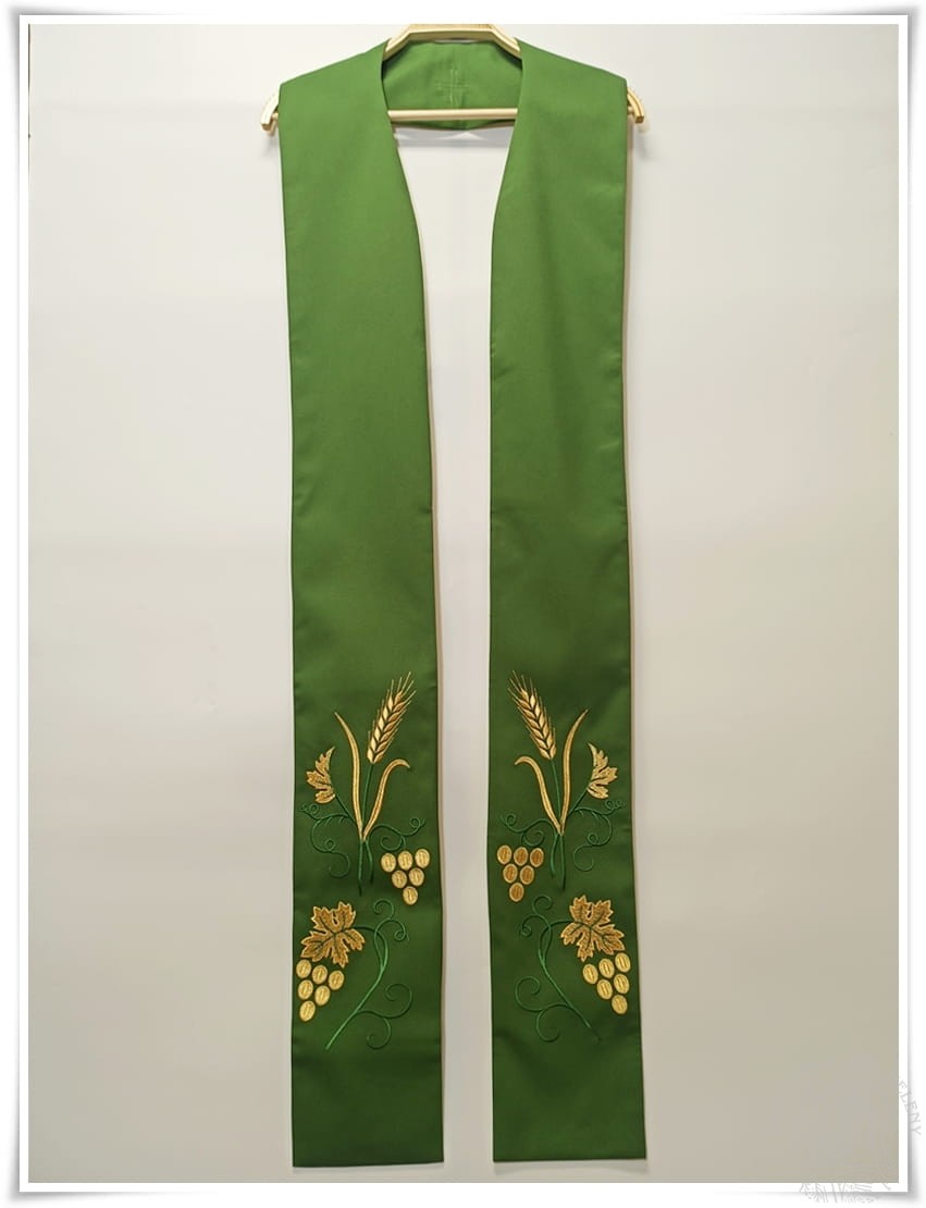 Stuła gotycka, kolor zielony, haft złoty, symbol roślinny kłosy i winogrona.