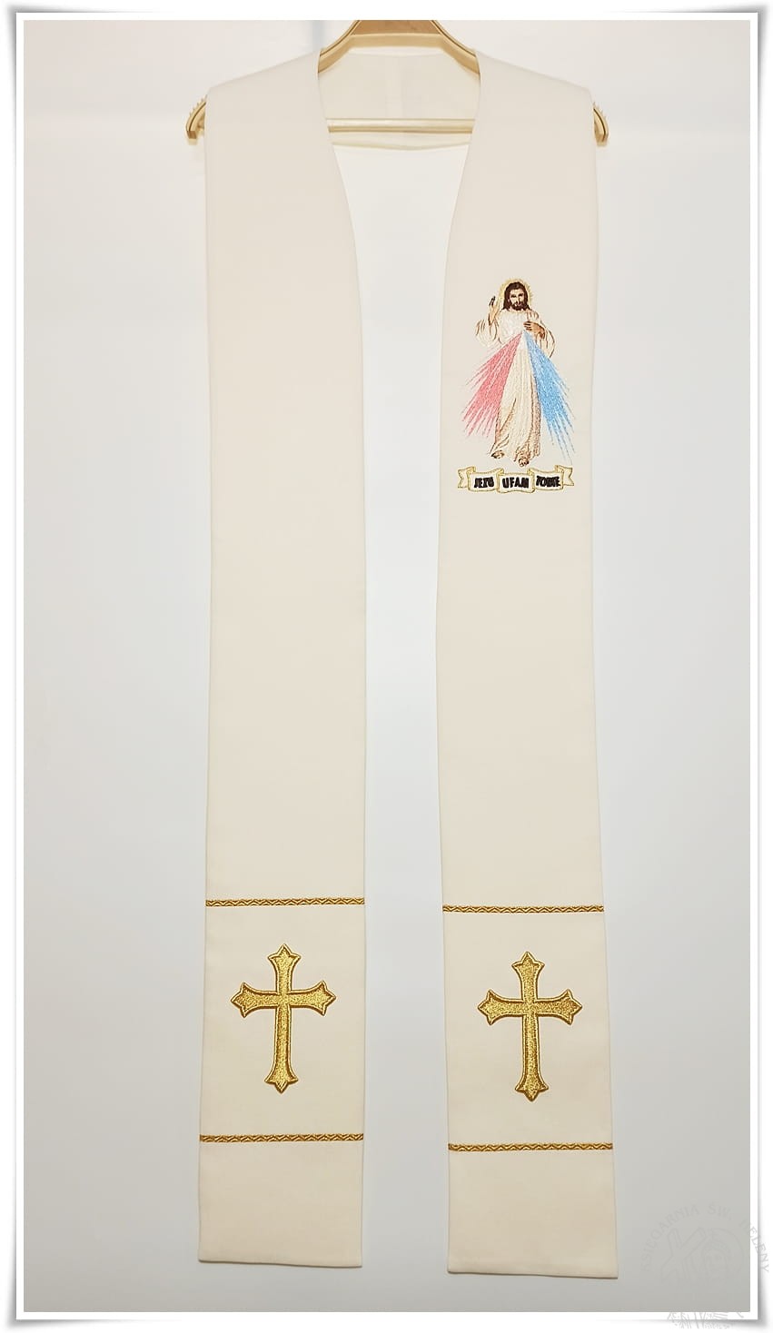 Stuła gotycka, kolor ecru, haft Jezu Ufam Tobie, Jezus Miłosierny, stuła Miłosierdzia Bożego.
