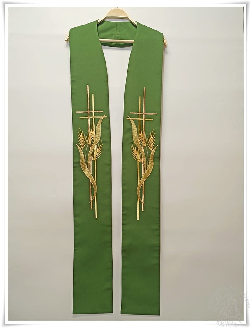 Stuła gotycka, haft maszynowy, symbol Krzyż i łany zboża. Kolor zielony, haft złoty.