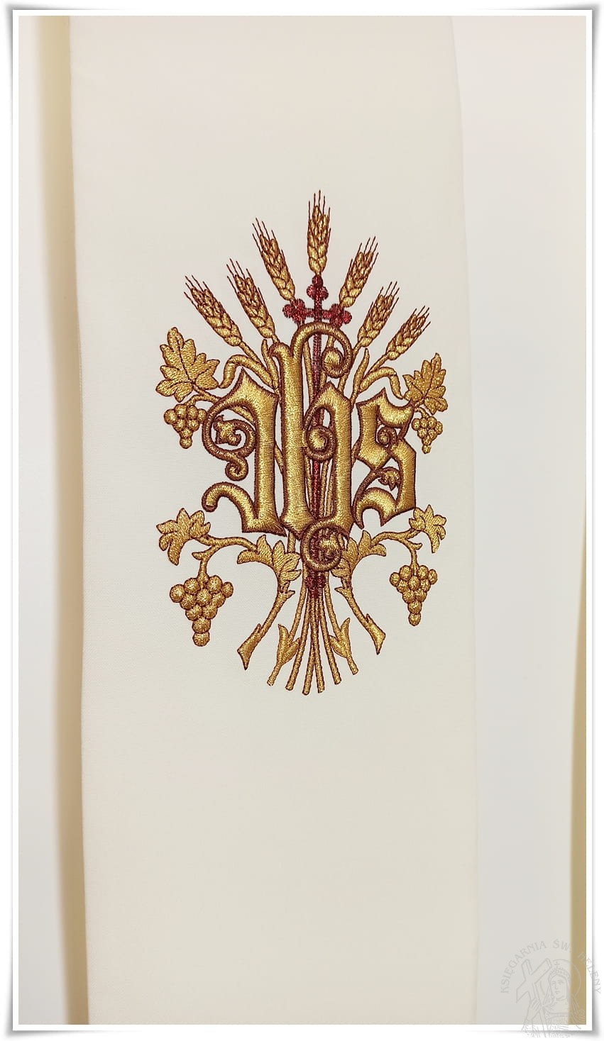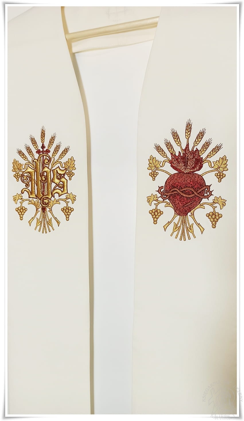 Stuła gotycka, haft maszynowy, kolor ecru, symbol gruby haft IHS i Serce Jezusa.