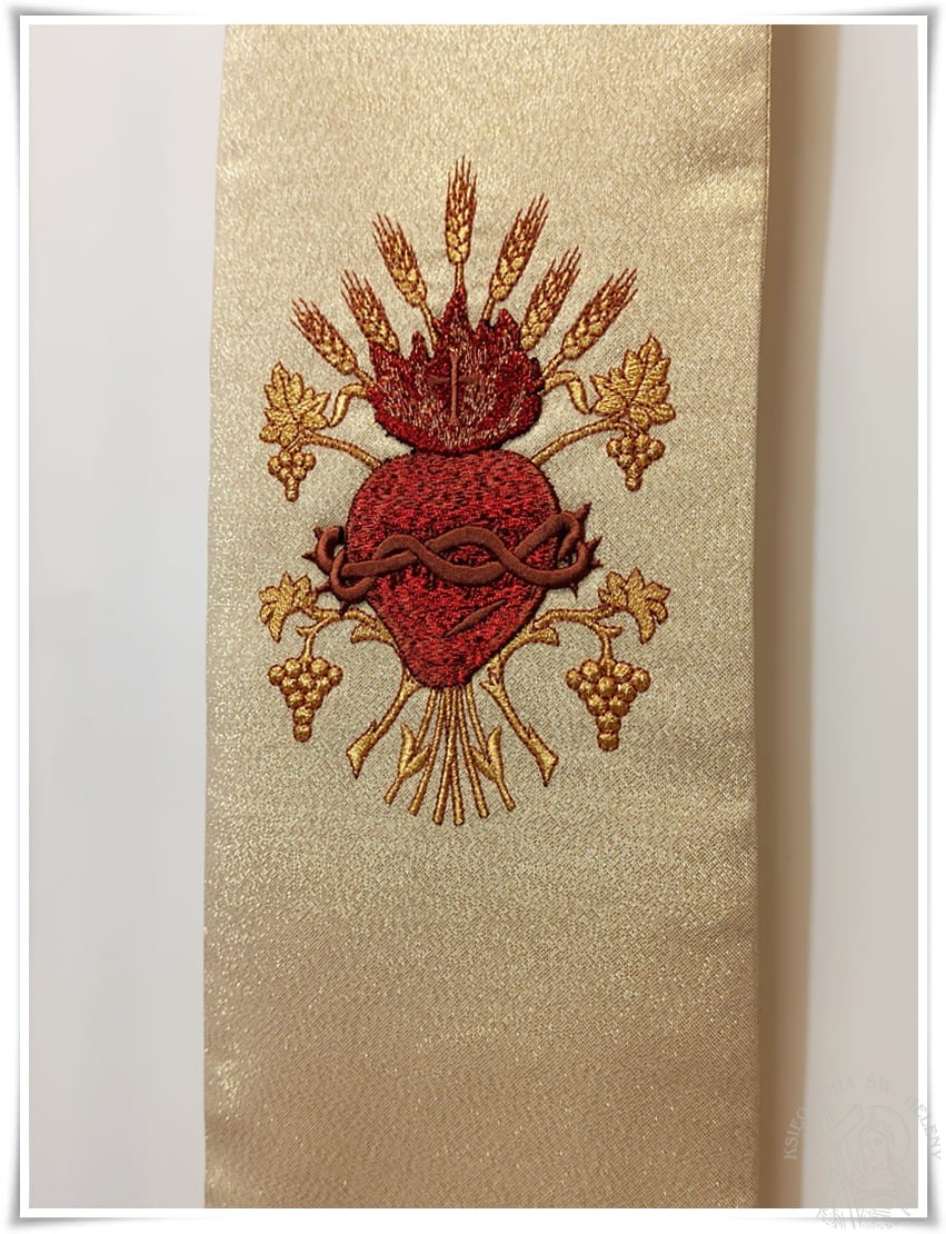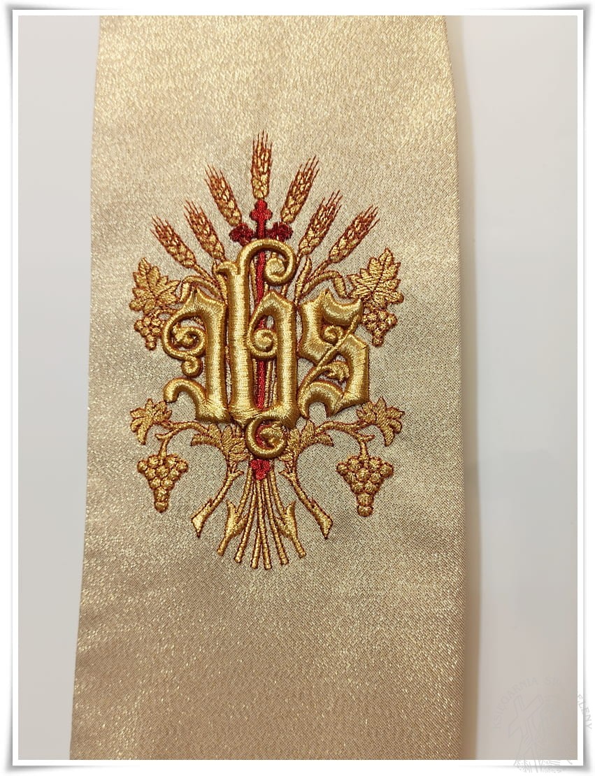 Stuła gotycka piękny wzór, haft maszynowy. Kolor stuły złoty, symbol gruby haft IHS i Serce Jezusa.