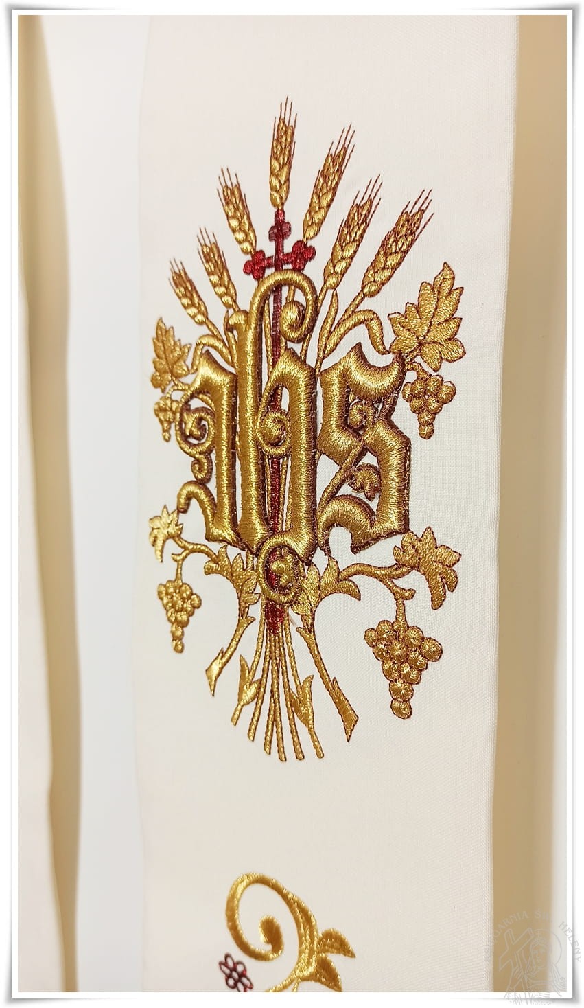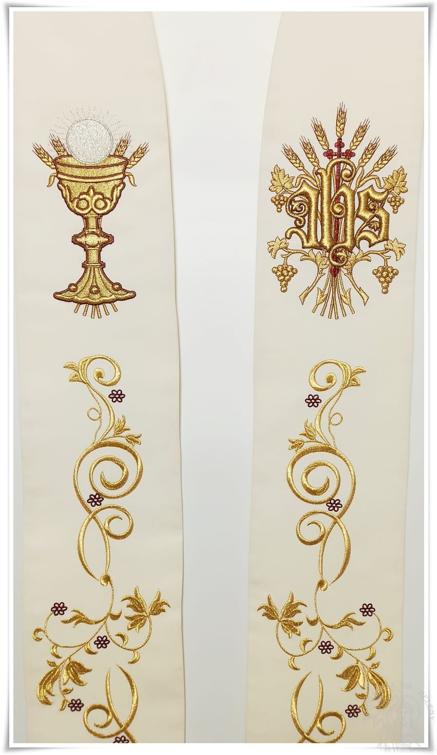 Stuła gotycka pięknie i bogato haftowana, haft maszynowy, symbol IHS i Kielich z Hostią. Kolor ecru, haft złoty.