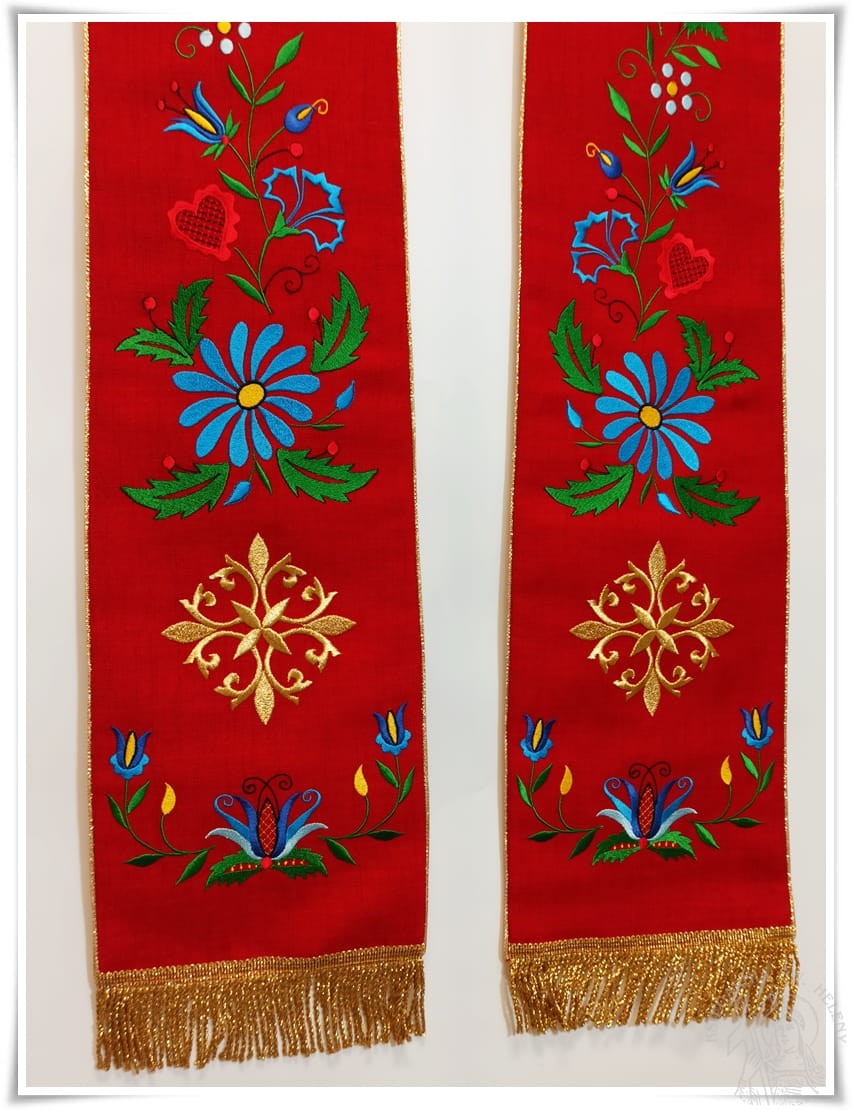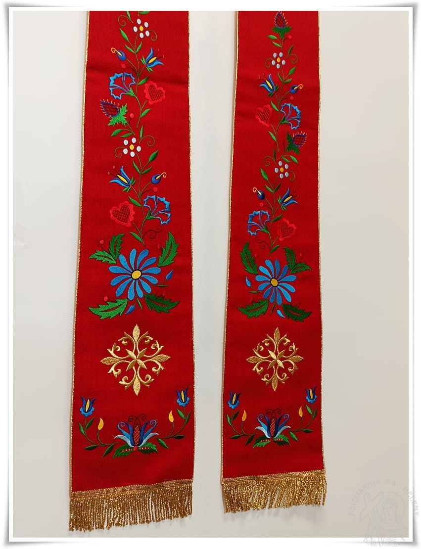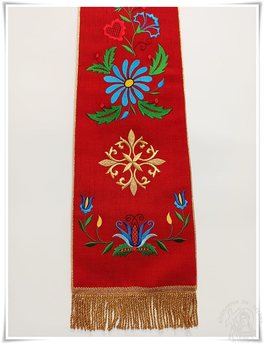 Stuła kapłańska bogato haftowana w kolorze czerwonym, wzór kaszubski.
