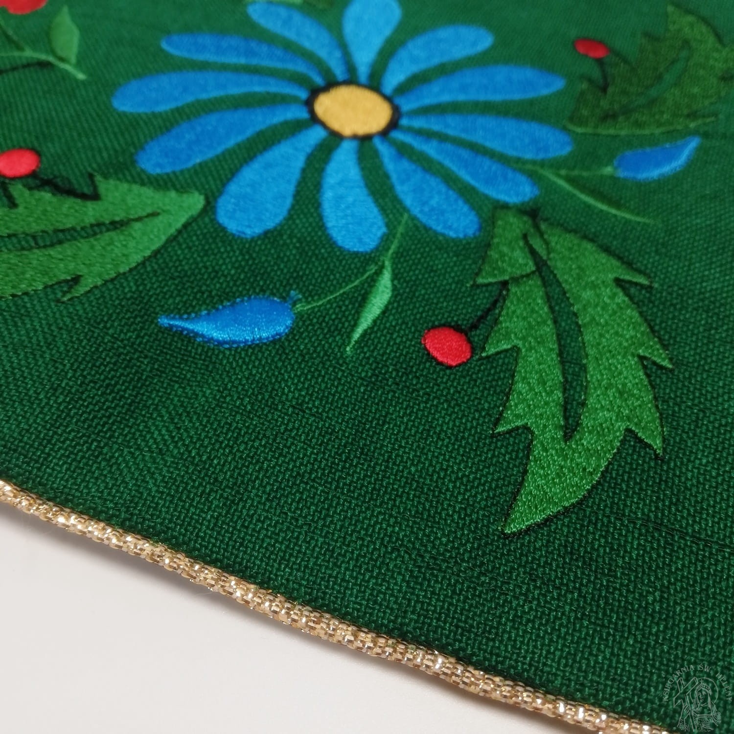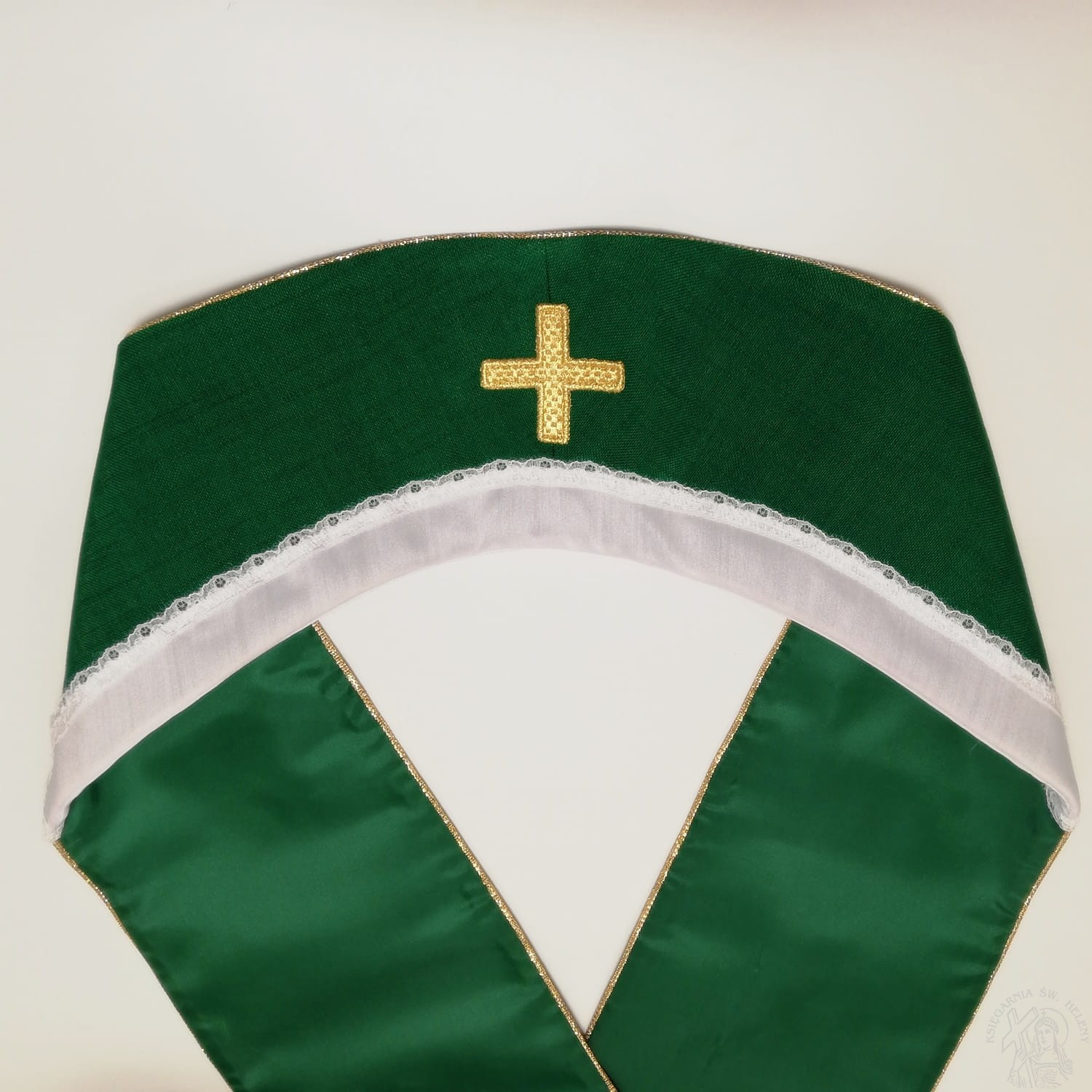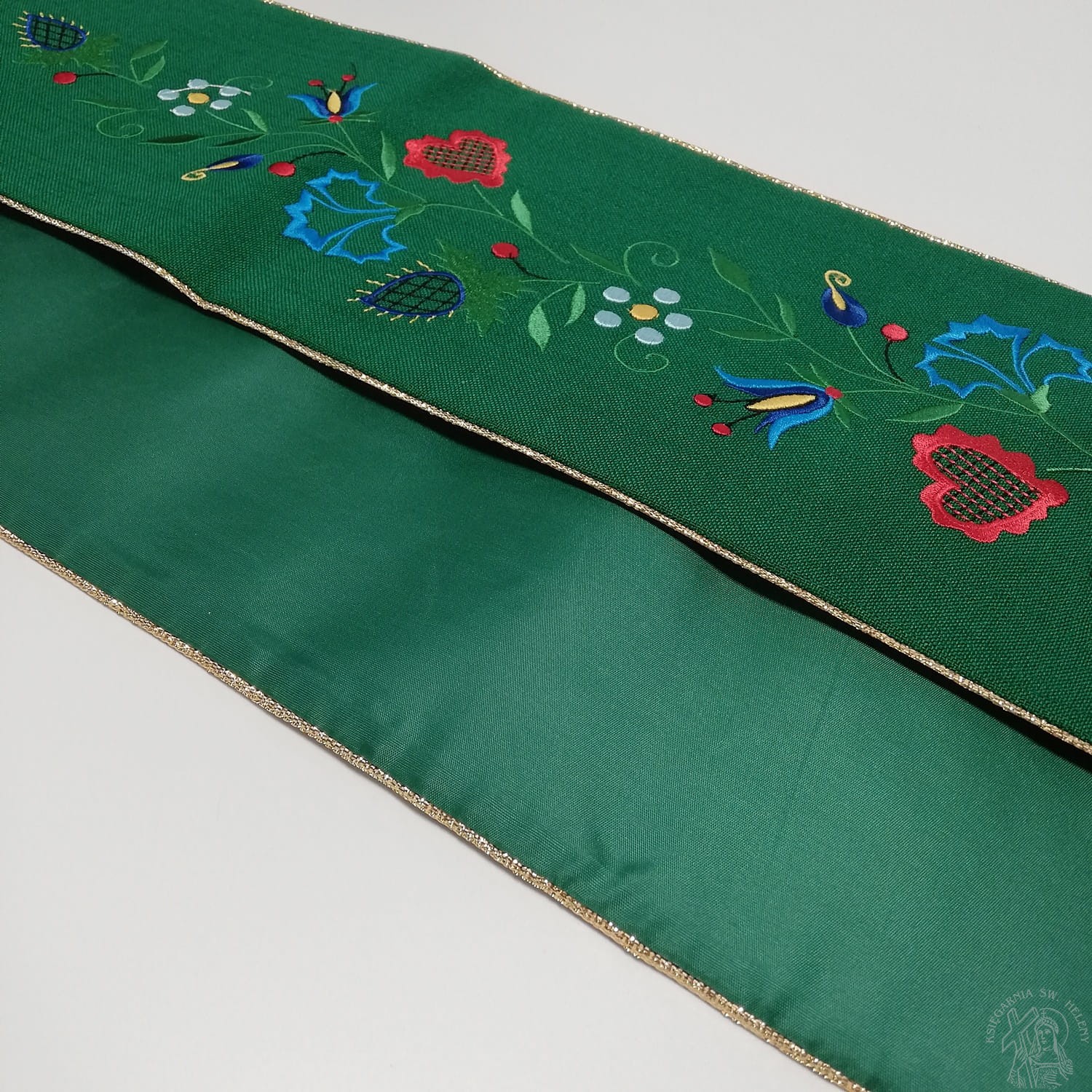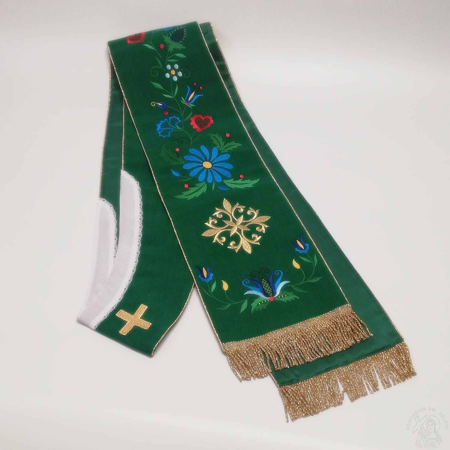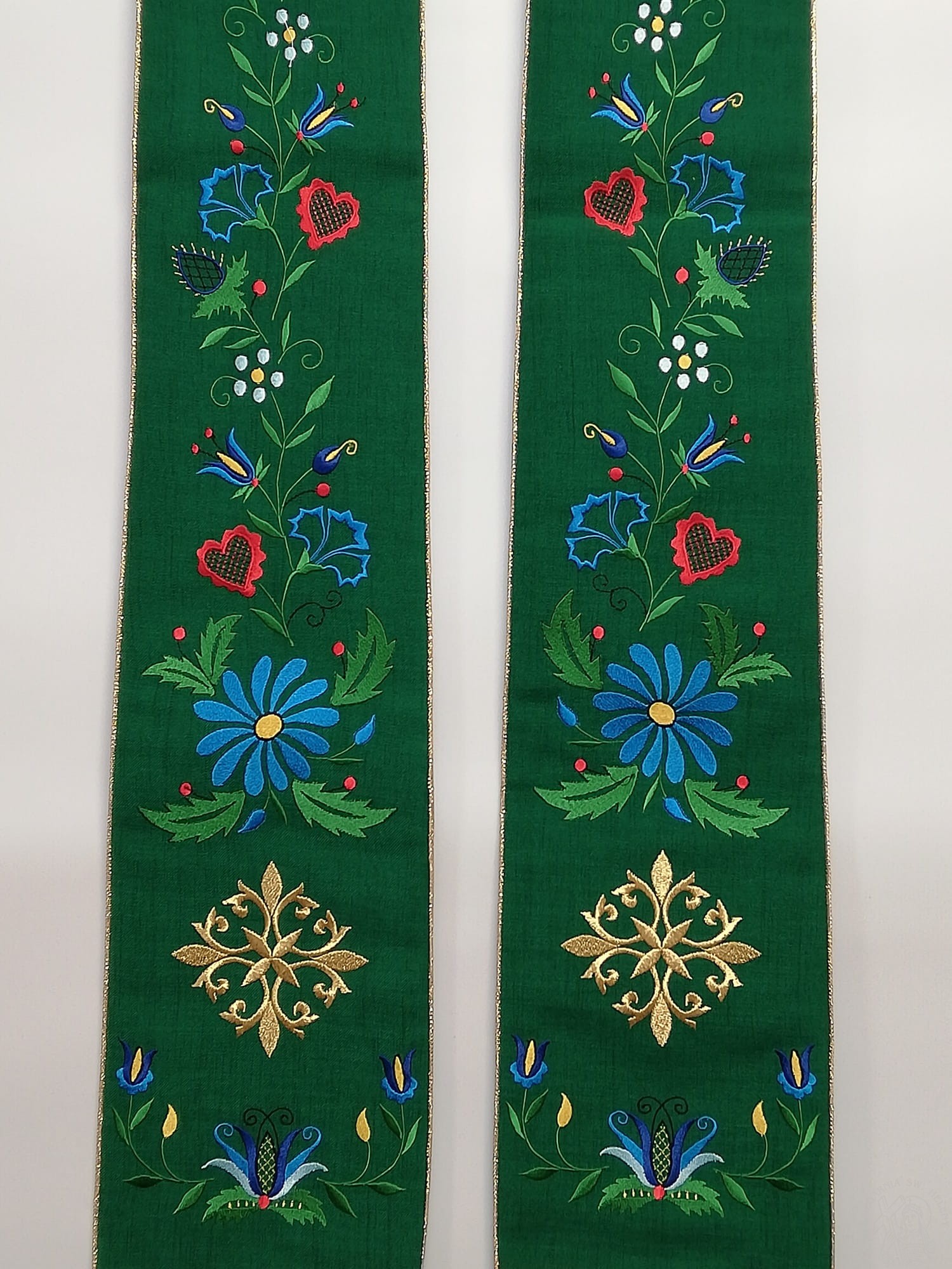 Stuła kapłańska bogato haftowana zielona, wzór kaszubski. Stuła zielona jest używana w okresie zwykłym roku liturgicznego, który jest najdłuższy. Została wykonana z wielką starannością w pracowni haftu artystycznego w Polsce.