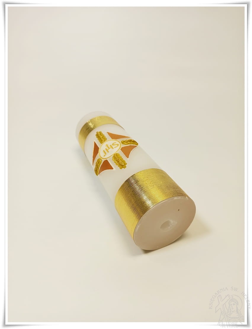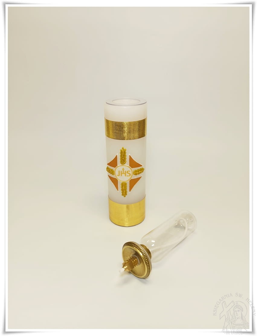 Świeca olejowa z wkładem na olej i regulacją wysokości knota. Aplikacja parafinowa IHS i kłosy zboża, symbole Eucharystyczne.