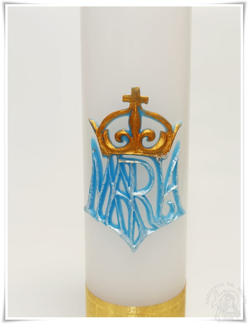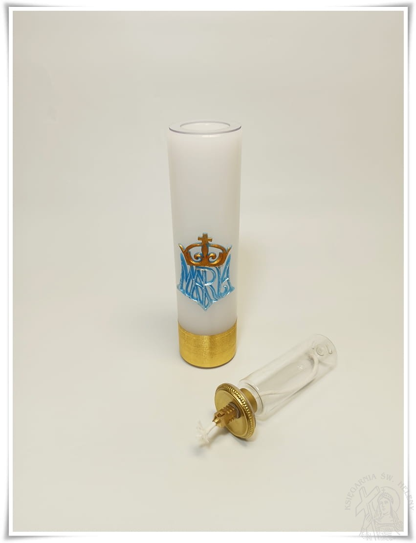 Świeca olejowa z wkładem na olej i regulacją wysokości knota. Aplikacja parafinowa symbol Maryjny.
