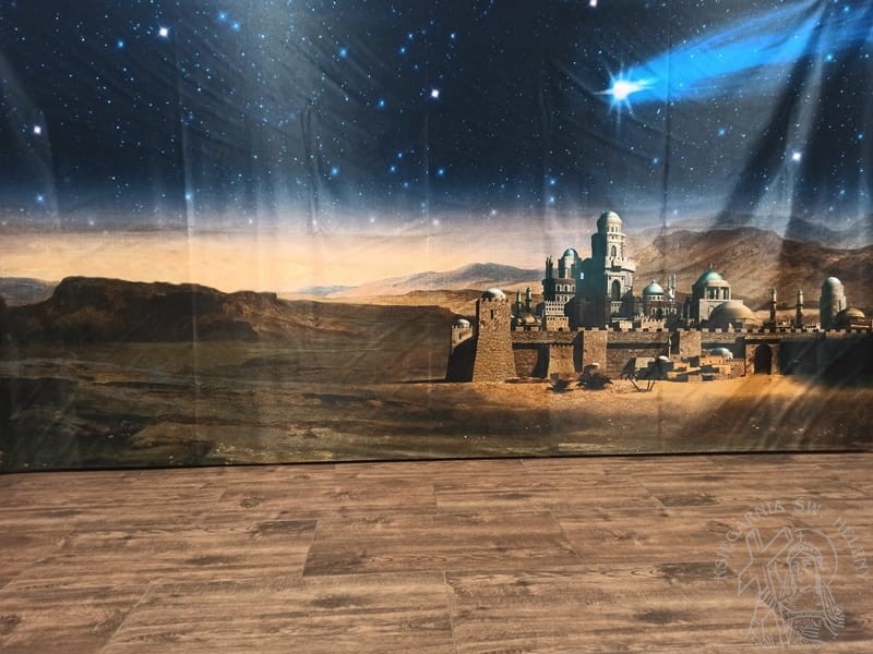 Tło do szopki Bożonarodzeniowej o wymiarach 300x150 wykonano na wysokiej jakości tkaninie. Tło odporne na warunki atmosferyczne.
